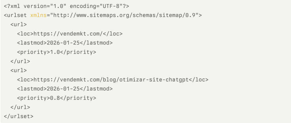 Primeiramente, crie um sitemap.xml completo listando todas as URLs importantes. Além disso, IAs (especialmente Gemini e Perplexity) usam sitemaps para descobrir conteúdo sistematicamente.