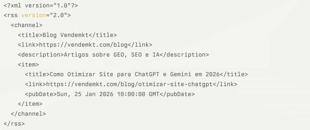 Exemplo: “Para otimizar site ChatGPT em 2026, você deve implementar schema markup completo, garantir que robots.txt permite acesso a bots de IA, criar conteúdo com dados originais e verificáveis, e estruturar informações em listas e tabelas que facilitam extração automática.”