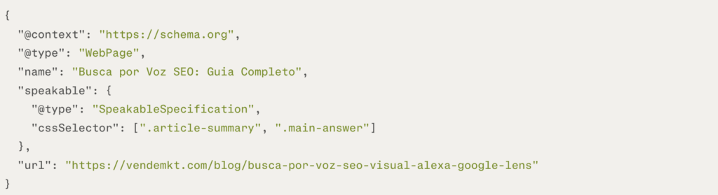 O schema speakable é, sem dúvida, o mais específico para busca por voz. Ele identifica seções do conteúdo que são mais adequadas para reprodução em áudio via TTS (text-to-speech). Atualmente, está em fase beta e funciona principalmente com o Google Assistente.