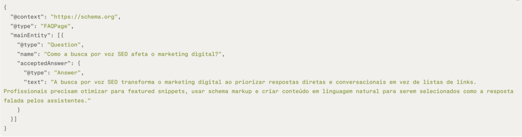 O FAQPage schema é extremamente eficaz para voz porque espelha o formato natural de pergunta e resposta. Dessa forma, assistentes podem extrair respostas diretamente para consultas conversacionais.