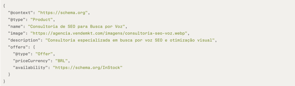 Quando o Google Lens identifica seu produto, o próximo passo do usuário é: “Quanto custa?” e “Está disponível?”. Se o Google precisa adivinhar, ele simplesmente não mostra seu produto. Em razão disso, o Product Schema com preço, disponibilidade e avaliações é obrigatório: